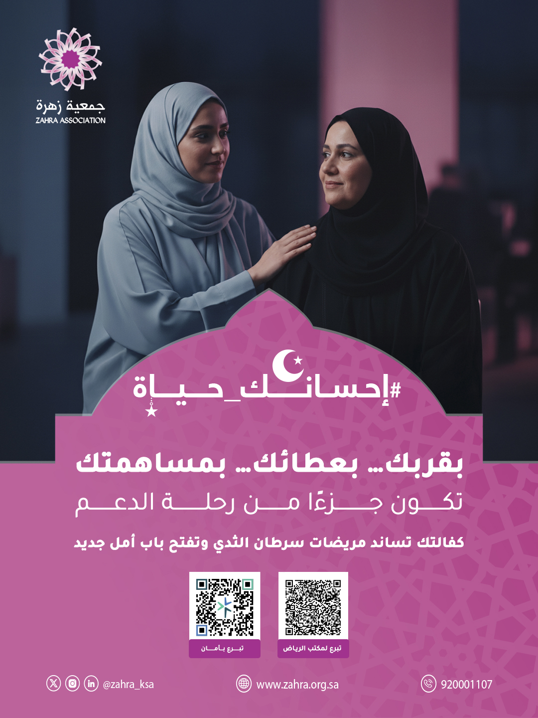 جمعية متخصصة بسرطان الثدي، تكونت بذرتها من رحم الألم، فتحول الألم إلى زهرة علم ومعرفة نسعى إلى نشرها من خلال الجمعية. حملت الدكتورة سعاد آل عبدالله (مؤسس الجمعية) منذ عام ١٩٩٧م وصية على لسان والدتها التي عانت مع المرض رحمة الله عليها، شكّلت العديد من المساهمات العظيمة للتوعية بسرطان الثدي على مدى الأعوام السابقة وصولًا إلى إنشاء جمعية زهرة عام ٢٠٠٧م واستمرارًا في تحقيق النجاحات في هذا المجال.