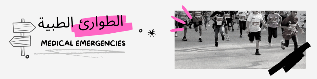 في حال وجود حالة طارئة لا سمح الله، يرجى التوجه لأقرب سيارة إسعاف أو إبلاغ المنظميــن لمباشرة الحالة. لسلامتكم، تم تخصيص 4 سيارات إسعاف وفرق مسعفين ترافق المسيرة للمشاركين